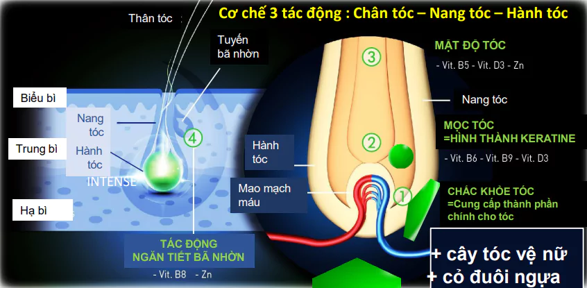 Cải thiện sức khỏe nang tóc: Cung cấp dưỡng chất nuôi dưỡng nang tóc, giúp nang tóc chắc khỏe, từ đó giảm thiểu tình trạng gãy rụng.